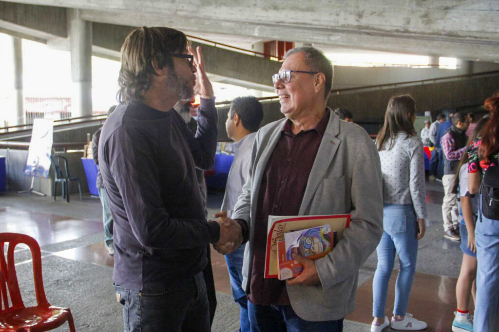 En el espacio ferial, donde conversó con lectores y lectoras, Cazal también compartió con Gonzalo Fragui, homenajeado nacional de la feria, a su paso por el stand de Mucuglifo, y el escritor caraqueño Luis Laya, ganador del Premio Nacional de Literatura Solar.