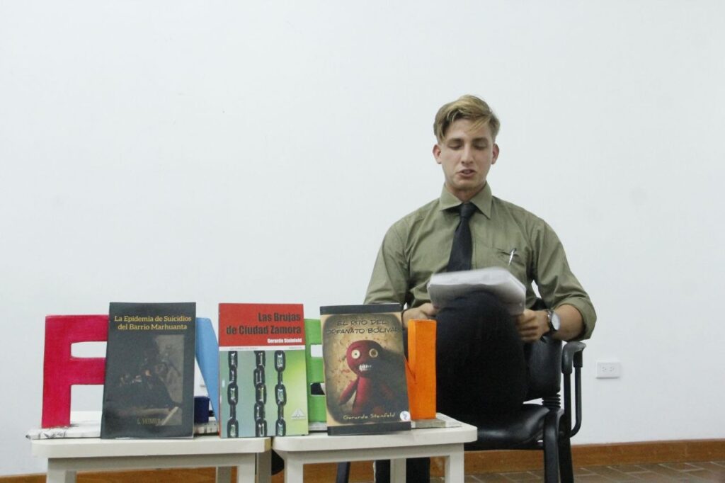 Durante su intervención en la feria, Steinfeld presentó sus obras autopublicadas: “La epidemia de suicidios del barrio Marhuanta” y “El rito del orfanato Bolívar”.